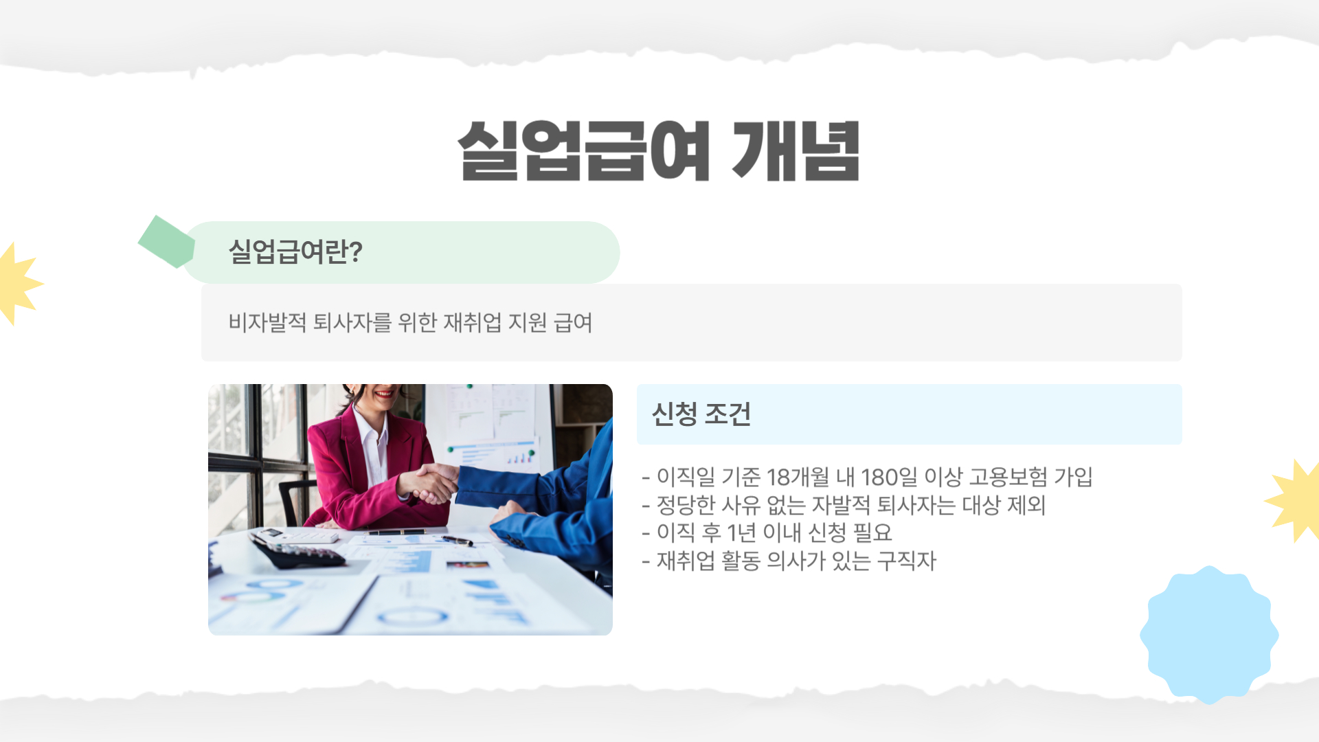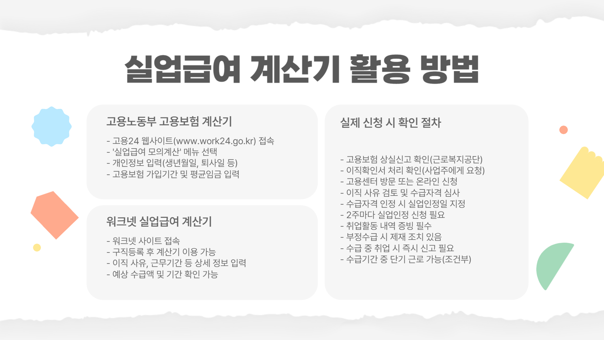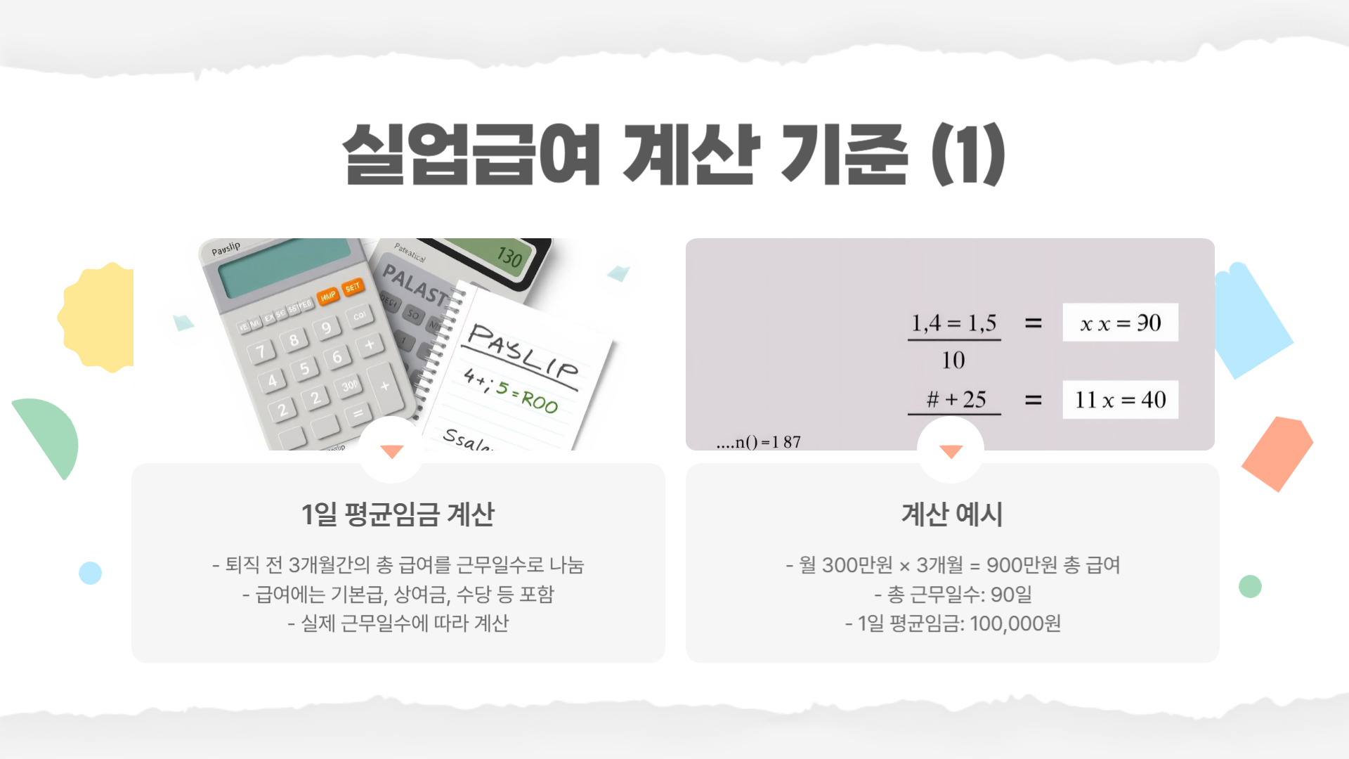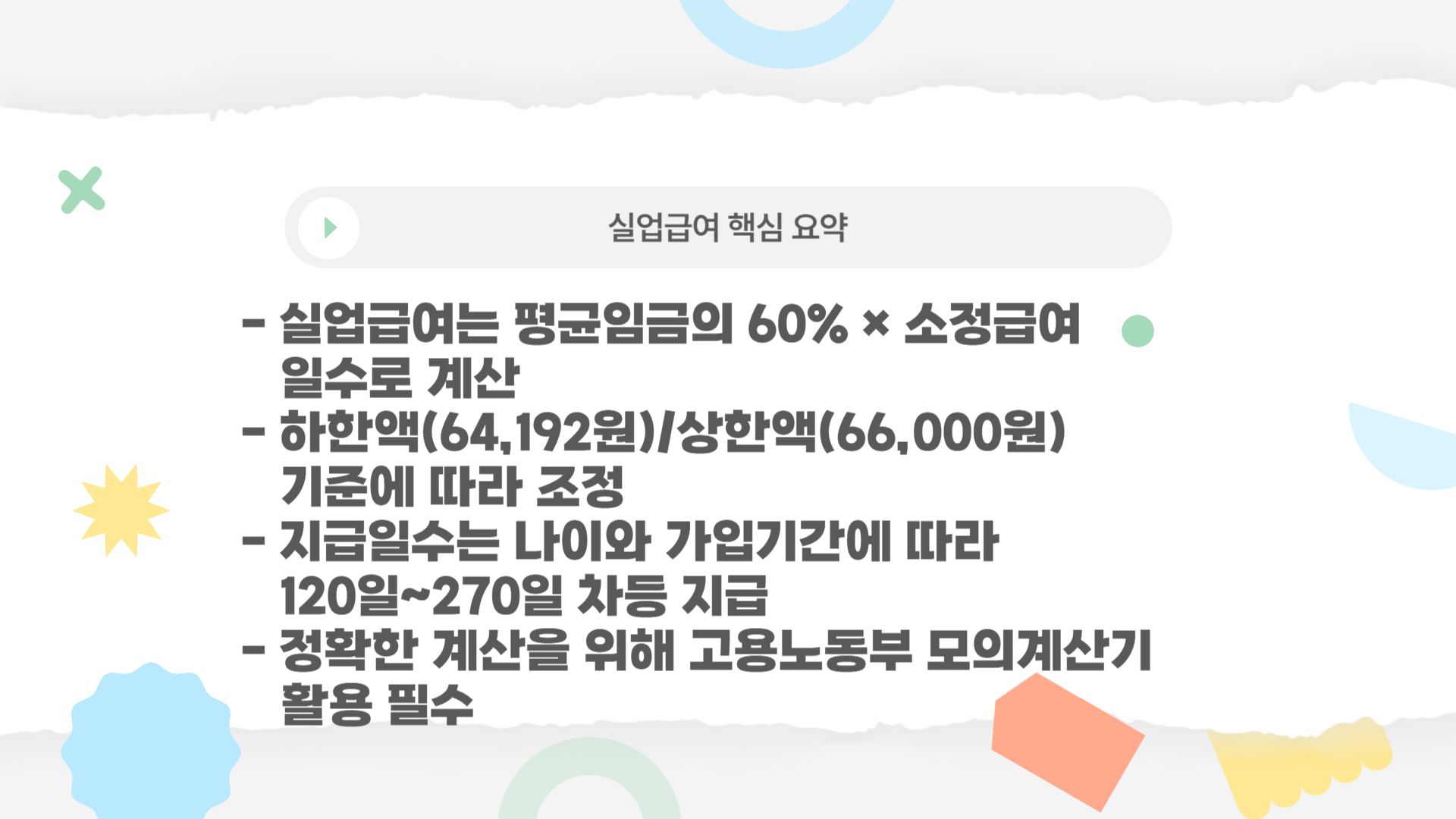 - 실업급여는 평균임금의 60% × 소정급여일수로 계산