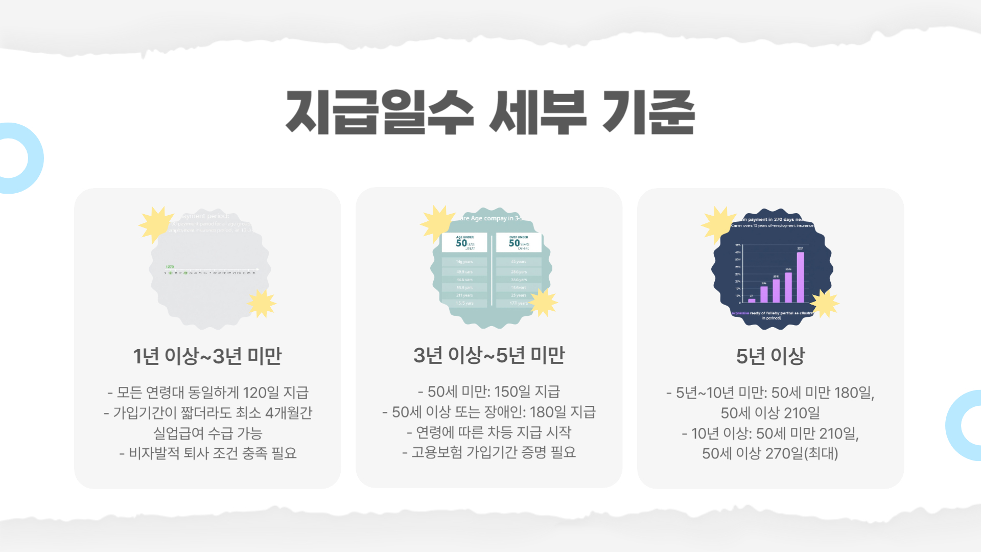 - 가입기간 3년, 만 40세 → 지급일수 150일