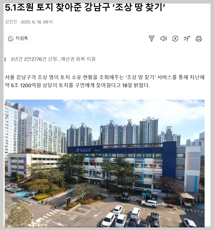 2024년 강남구는 조상 땅 찾기 서비스로 약 1만4천 필지의 토지를 주민에게 되찾아줬습니다.